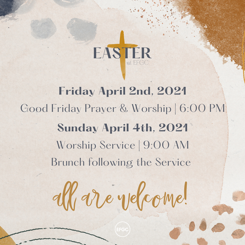 We can't wait to celebrate our resurrected King, this year at our Easter services. Join us on Good Friday (April 2nd) at 6 PM for a special prayer and worship service. And then on Sunday April 4th for a special service and brunch following. Childcare will be provided at all services. Let's celebrate together!